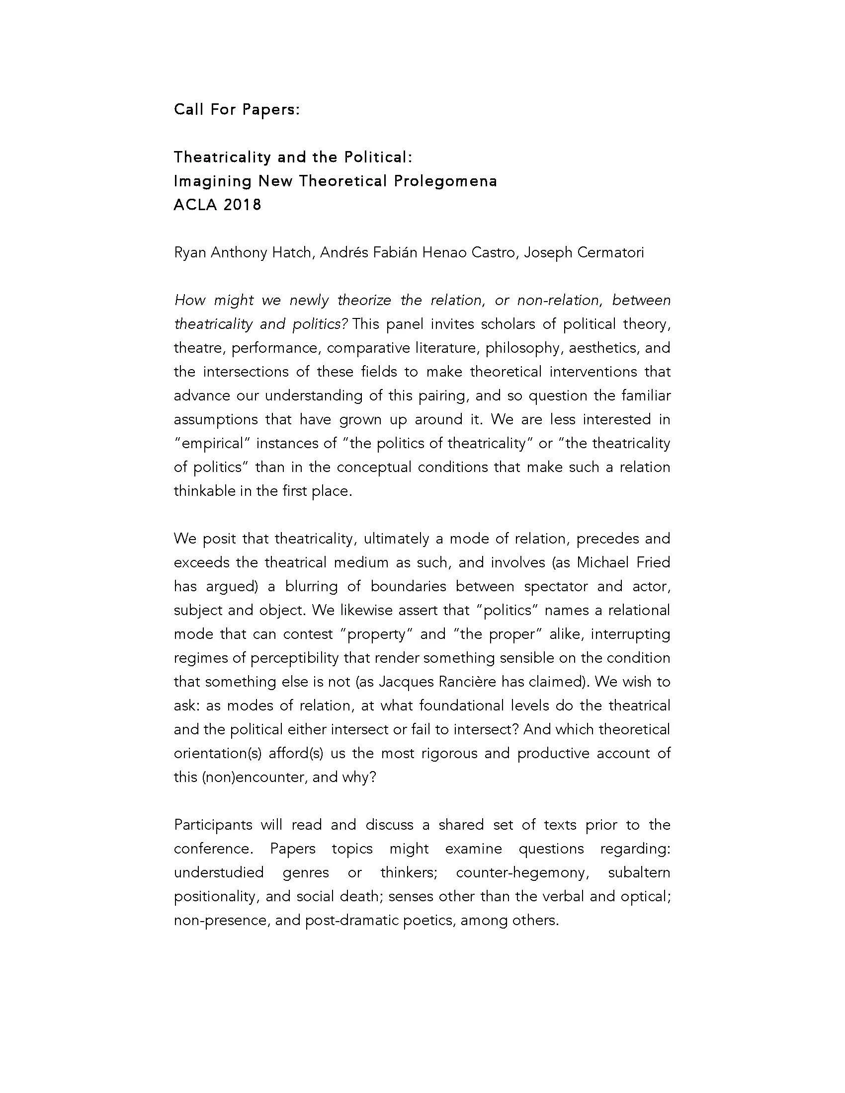 This seminar took place at the 2018 ACLA annual meeting, and asked: How might we newly theorize the relation, or non-relation, between theatricality and politics? The seminar invited scholars of political theory, theatre, performance, comparative literature, philosophy, aesthetics, and the intersections of these fields to make theoretical interventions that advanced our understanding of this pairing, and so questioned the familiar assumptions that have grown up around it.
